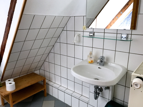 Bei der Wohnung „Theresia“ handelt es sich um eine 60m2 Maisonettewohnung über 2 Etagen mit drei einzelnen Schlafzimmern im zweiten und dritten Obergeschoss. Sie kann mit 3 Einzelpersonen oder mit 1 Paar und 2 weiteren Personen belegt werden. Den Mittelpunkt der Wohnung bildet eine große Wohnküche.