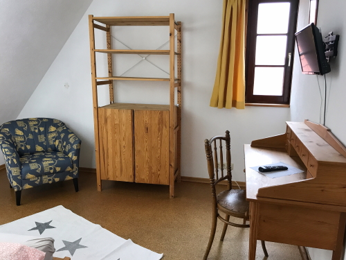 Gehen Sie bitte die Treppe ganz hoch und dann bis ans Ende des Ganges. Dort befindet sich Ihre Wohnung „Theresia“.