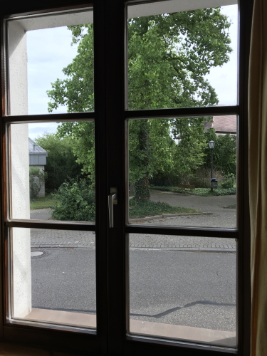 Use the guest entrance on the right side of the house (opposite the church).